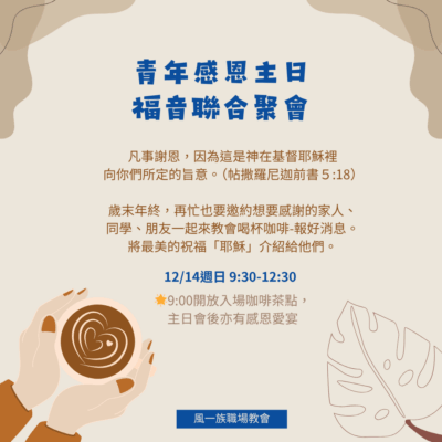 聚會資訊兒童主日學信息摘要新朋友專區 主日信息2025-11-23-葉子齊傳道-活潑常存的道2025-11-16-蔡偉和牧師-惟有主站在我旁邊 教會公告20251214-青年感恩主日-福音聯合聚會20251130-兒童主日學–《聖經創意美學營》 更多公告訊息 主日信息摘要 在神的家永遠為您預備一個位置 宣教足跡 英國格拉斯哥 越南 胡志明市